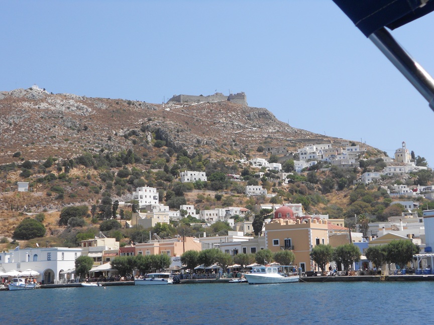 Anchored at the port of Leros Agia. At the top of the hill, you can see the castle.
