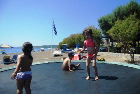 Anyway, we did not get lost, back down the hills to Vassilika, Polichnitos, and Vatera by the sea. We stopped at Aphrodite hotel to use their facilities, pool, playground and beach. They said, we only had to drink something, otherwise 3 Euro per person. Kids enjoyed the clean beach and water, a pristine day. Later the spent an additional two hours at the pool.